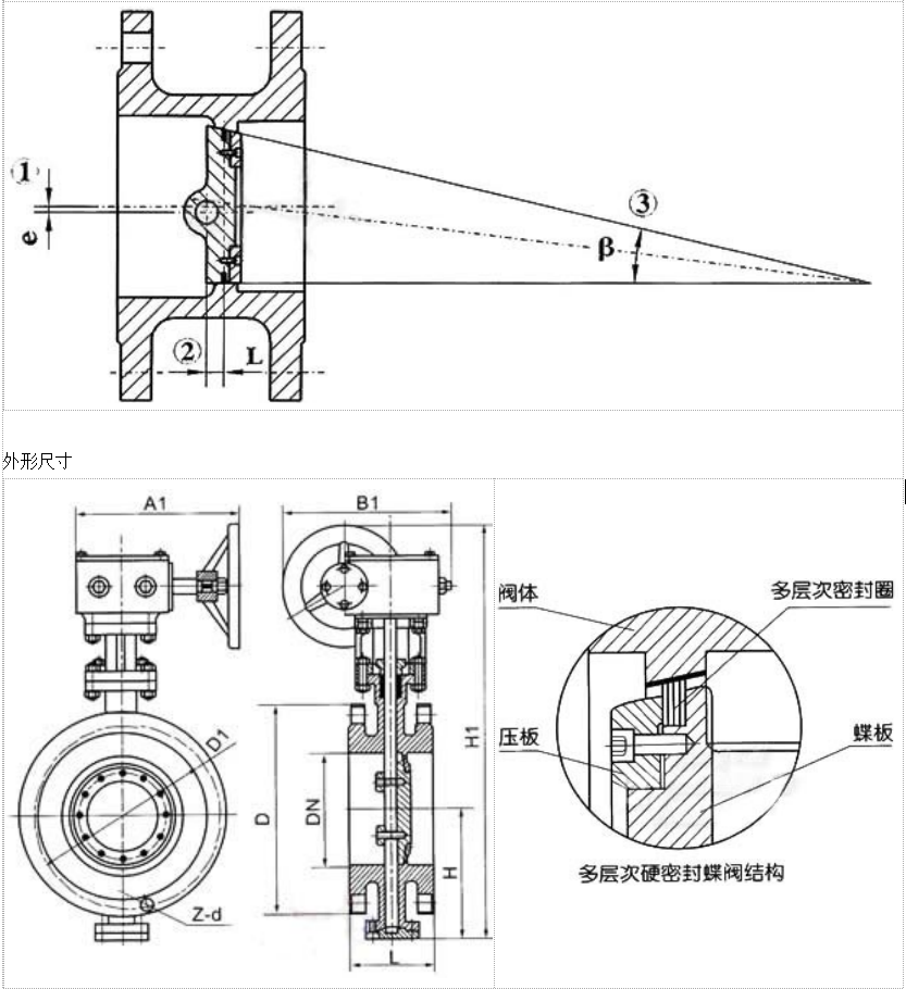 當(dāng)閥門開啟時(shí),蝶板與閥座在關(guān)閉時(shí)瞬間接觸,利用蝶板偏心1、偏心2迅速脫離閥座,降低了密封副的磨損,磨擦力矩小,開啟靈活。偏心錐面3,使閥門在開啟或關(guān)閉時(shí)蝶板能通過閥座內(nèi)孔,實(shí)現(xiàn)接觸密封。另外,錐形蝶板的旋轉(zhuǎn)半徑大于密封副接觸位置的旋轉(zhuǎn)半徑,故蝶板在閥門關(guān)閉時(shí)將出現(xiàn)越關(guān)越緊,能夠?qū)崿F(xiàn)自鎖,防止蝶板過位。